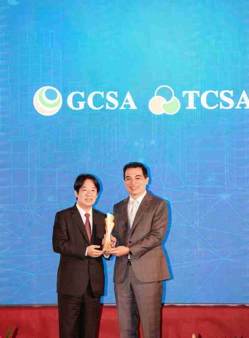 达全方位永续表现获全球永续奖及台湾永续奖肯定,,由副总统赖清德颁奖 (左),,尊龙z6总经理柯富仁 (右) 代表领奖