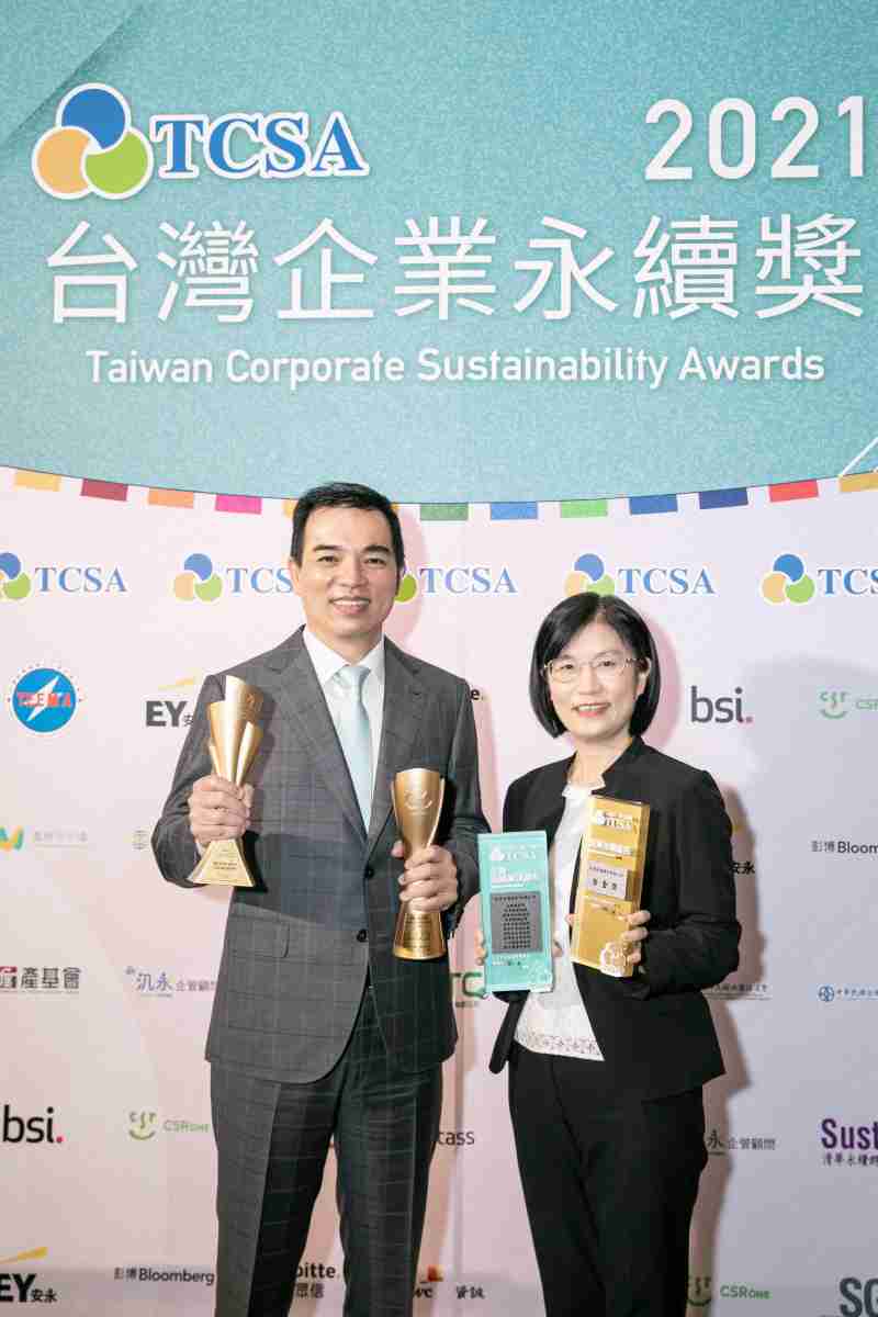 达在台湾永续奖所评比环境、、、、社会、、、、治理等各面向的永续绩效均获高度肯定 (左:尊龙z6光电总经理暨营运长柯富仁,,右:尊龙z6光电永续长古秀华)