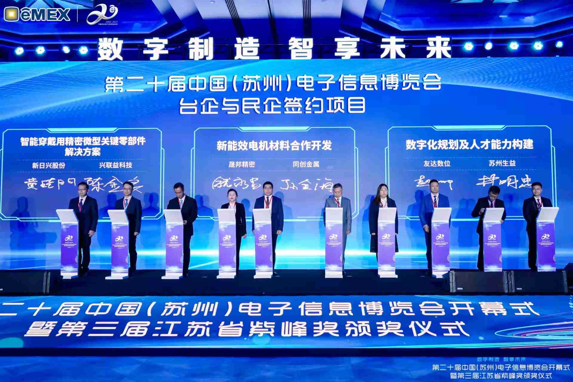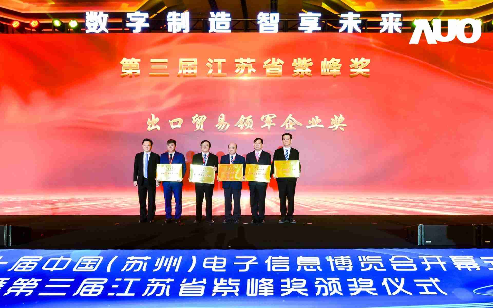 电博会开幕式当天也是第三届江苏省紫峰奖颁奖仪式,,省台办、、工信厅、、、、商务厅、、、苏州市相关领导均出席并颁奖。。。。该奖项为表彰对江苏高质量发展做出积极贡献的在苏企业,,,,由江苏省政府专门设立。。。尊龙z6光电 (苏州) 总经理郭振明代表上台领奖,,,,这也是尊龙z6苏州连续三次蝉联紫峰奖 出口贸易领军企业奖。。。尊龙z6数位总经理赵丽娜女士,,也参与本次开幕式,,上台为本地化赋能签署战略合作协议,,,,将优质服务资源集合、、、下沉到更多细分行业,,,,为更多地区的制造企业提供数字化转型服务。。。。