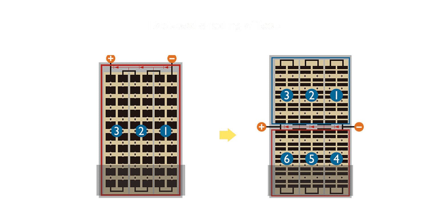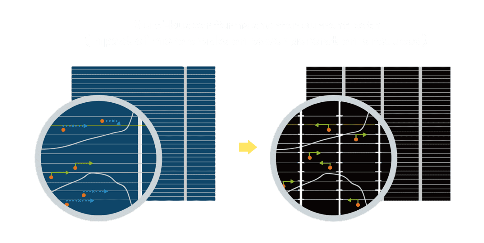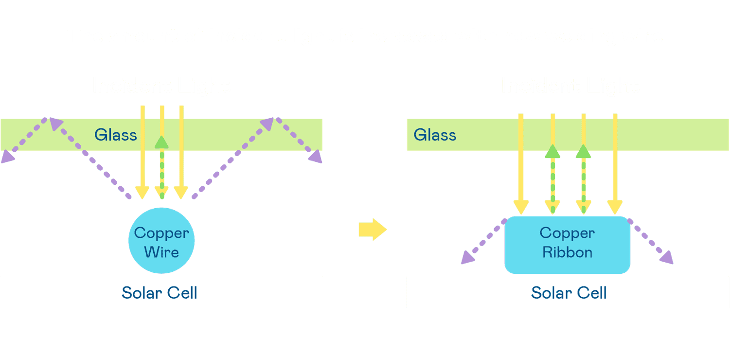- 电池使用多条铜导线 (Copper wire) 于电池片上形成较短的电流路径,,提高电流收集效率,,,采用圆形设计的铜导线较传统扁平式的铜焊带 (Ribbon),,,可增加入射至电池的光线量。。