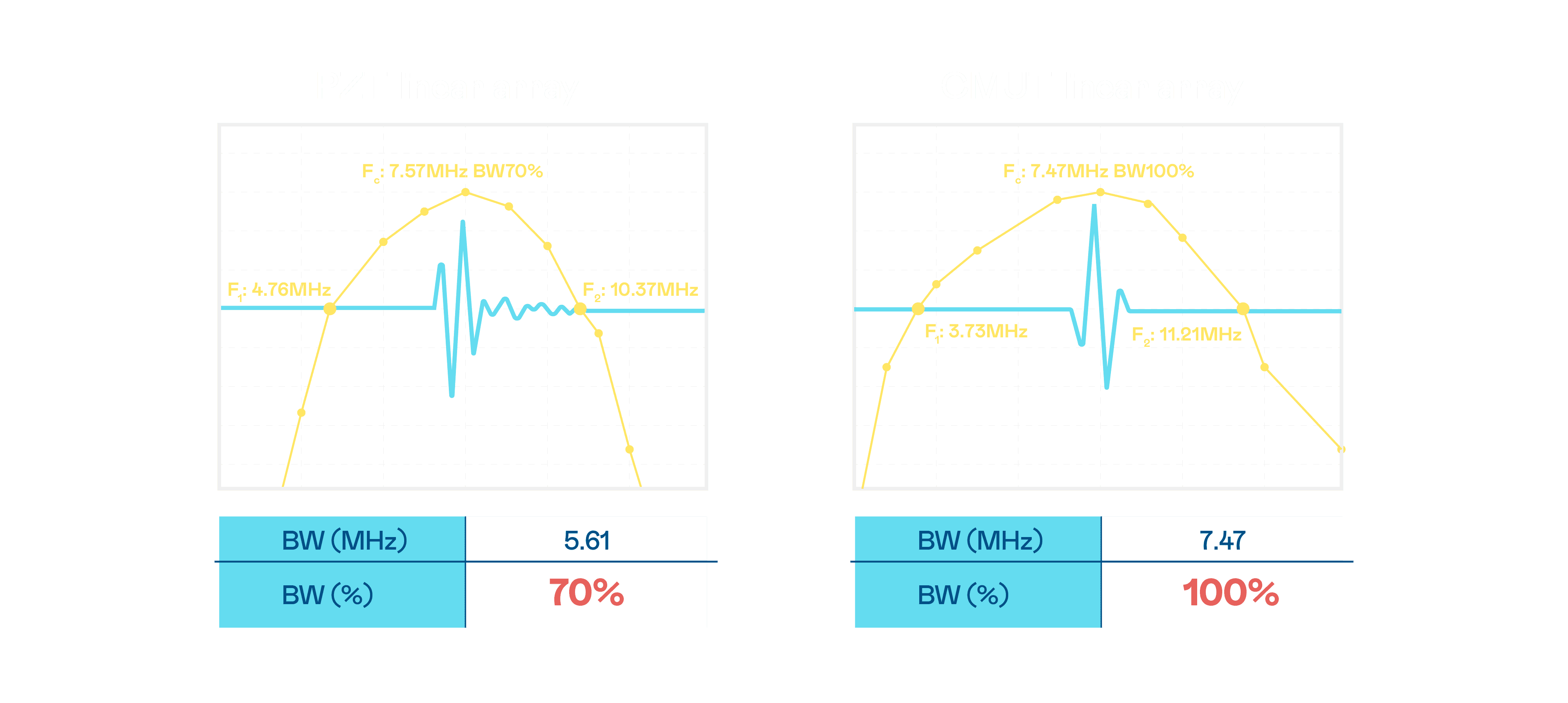 超音波影像的解析度高低,,首先取决于探头能发出的讯号频宽。。。尊龙z6 CMUT 可提供高清晰的超音波讯号,,,提供高频宽、、、、高灵敏度、、、、影像纹理细节更高的超音波影像,,,协助医护人员缩短影像判读时间及利用精准的医疗影像进行诊断。。。